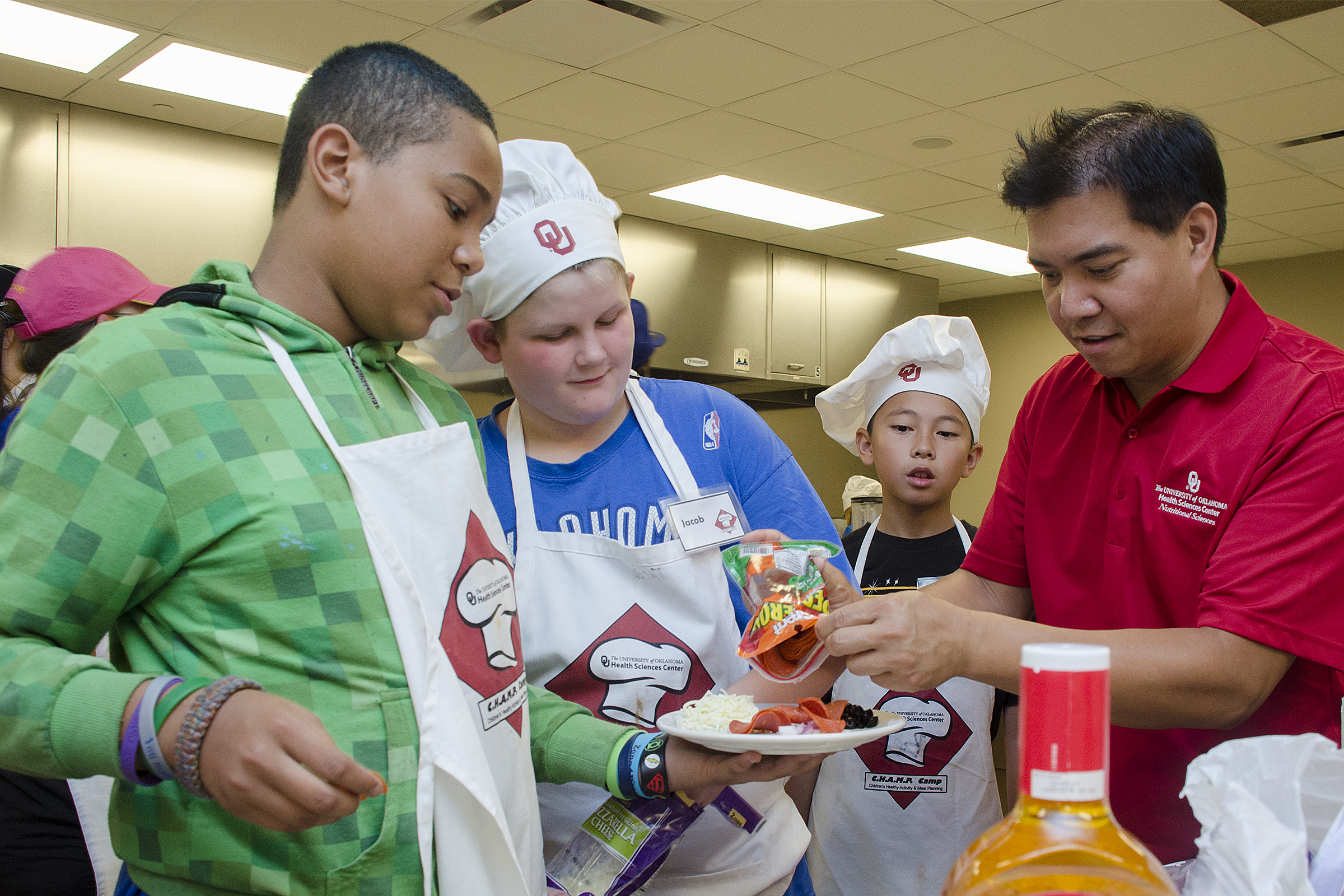 Dietetic interns and students in the Nutritional Sciences Department under the direction of Professor Brian dela Cruz, provided a cooking camp to kids called C.H.A.M.P. (Children’s Healthy Activities and Meal Planning) Camp. The children learned about healthy eating, cooking healthy meals and the importance of physical activity. To learn more about C.H.A.M.P. Camp and the activities involved, read the article found in the latest edition of Sooner Magazine.